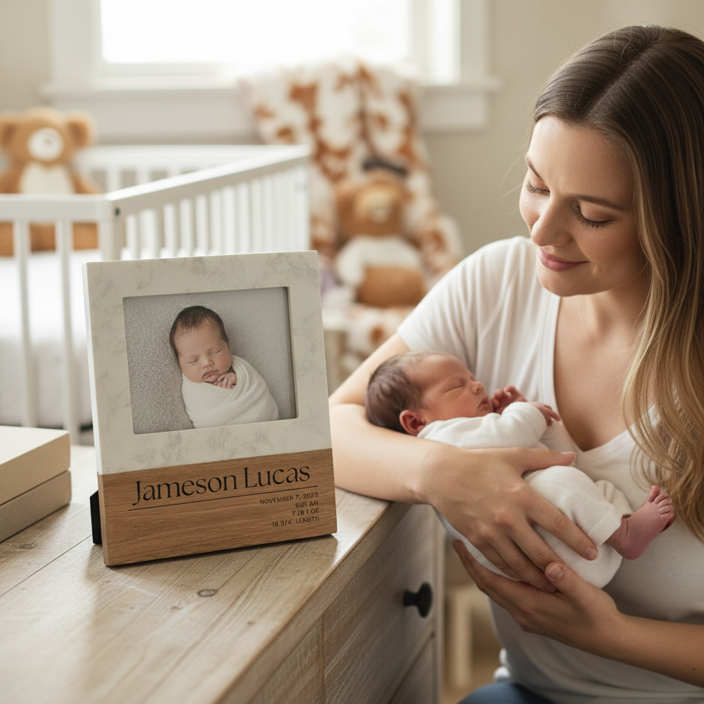 Each frame is laser engraved with the baby’s name, birth date, time, weight, and length, creating a timeless keepsake for parents and grandparents alike. The combination of smooth marble and warm natural wood makes it a perfect addition to a nursery, shelf, or bedside table.